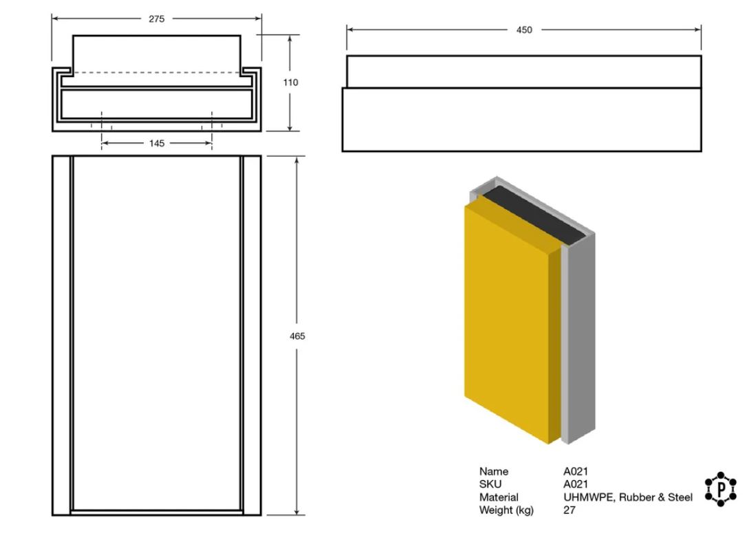 The A021 Dock Bumper has a large impact area with no holes in the face plate for the back of the truck to snag on. The 50mm thick face can slide freely up and down in its steel cradle back plate.